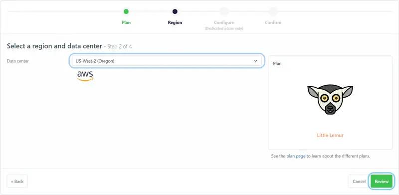 After signing up we will be redirected to create a new instance page where we have to choose a plan and region for our instance. Here we will go with Little Lemur(Free) as our plan and